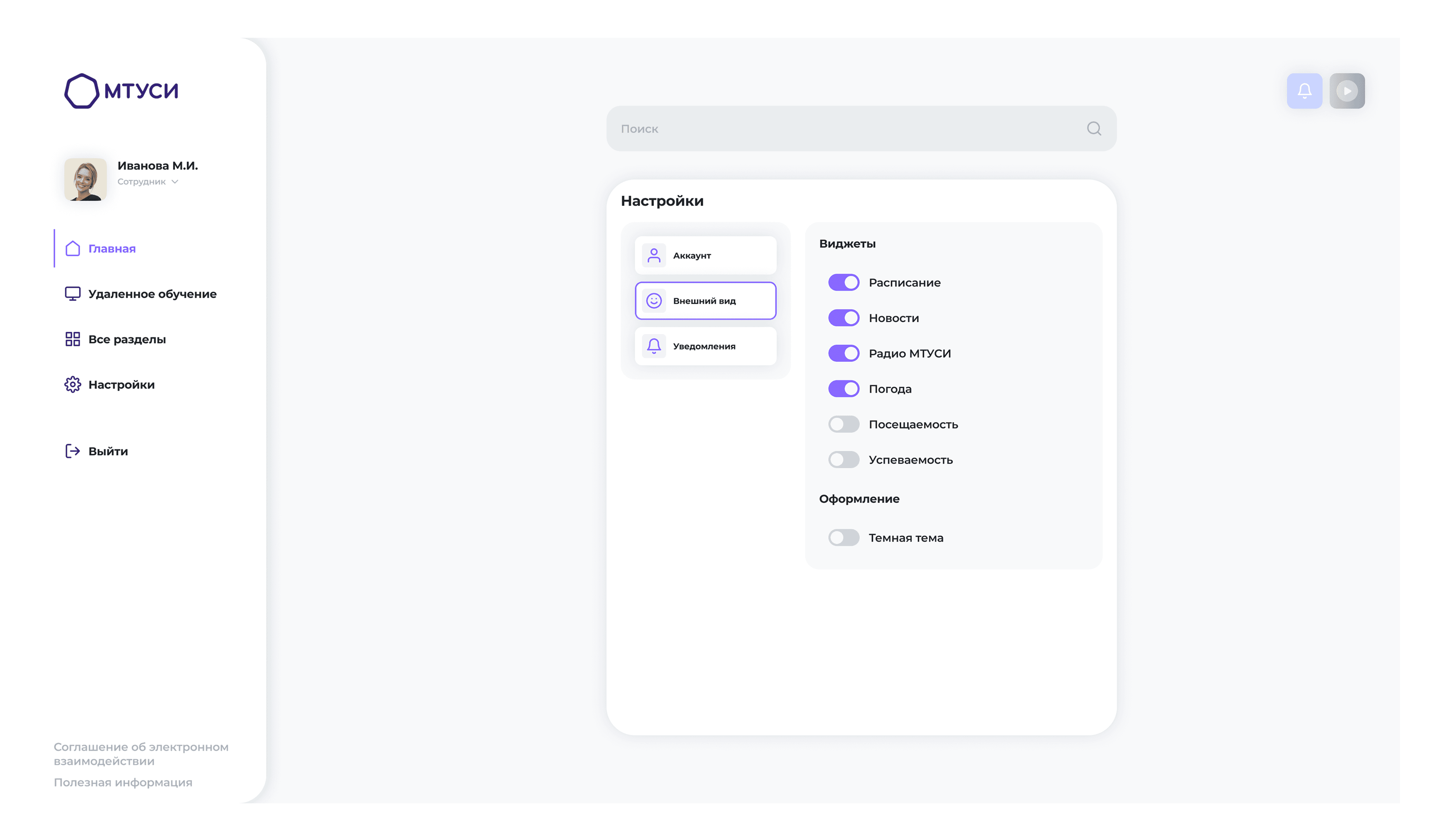 Главный экран состоит из виджетов: пользователь сам может настраивать состав блоков. По умолчанию отображается расписание, новости, радио и погода. Каждый блок можно настроить или скрыть. Также реализован быстрый доступ к критическим разделам. В виджете показываем расписание на текущий день.