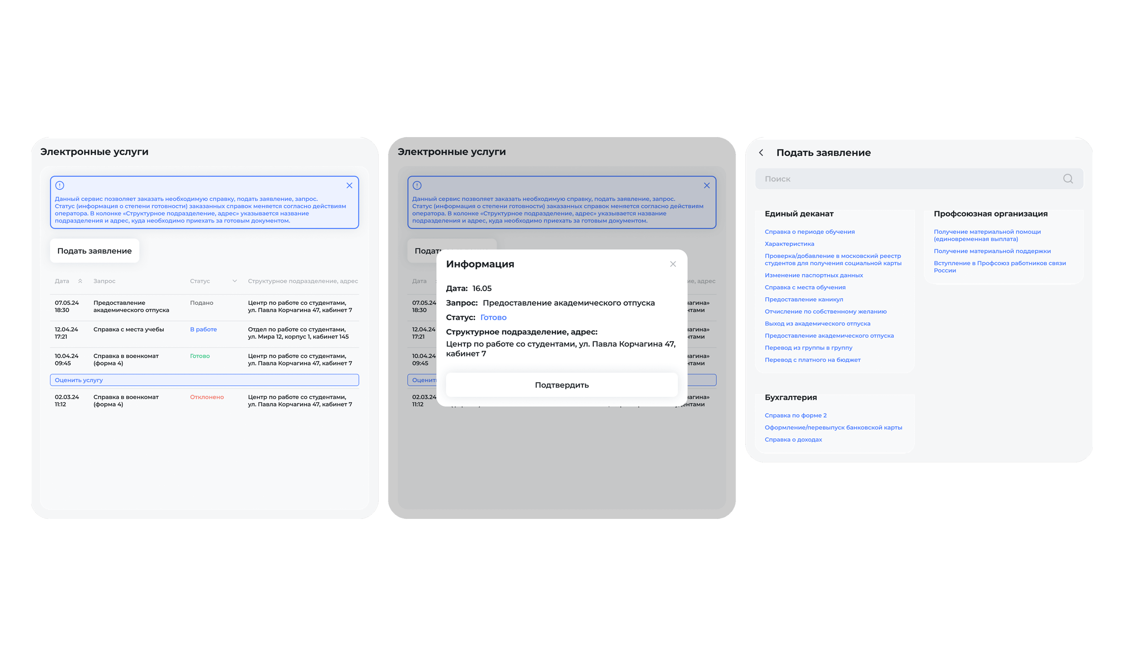 Переход к цифровой системе снизил нагрузку на деканат, улучшил качество обслуживания и дал пользователям ощущение предсказуемого и надёжного инструмента — с интуитивным UX, коротким путём к цели и продуманным визуальным оформлением, включая тёмную тему.